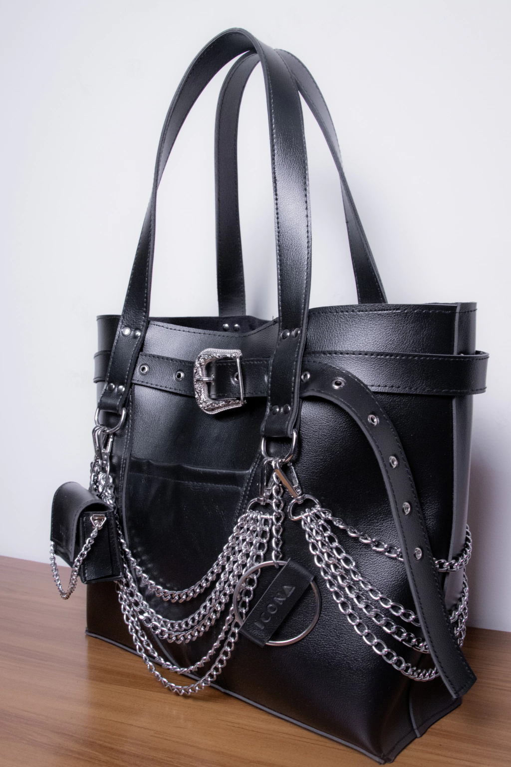 It features an inner pocket for documents, key holder, outer pocket, and removable chains that elevate its design. The bag also includes a detachable belt you can wear and an adjustable crossbody strap, making it the perfect multifunctional accessory.